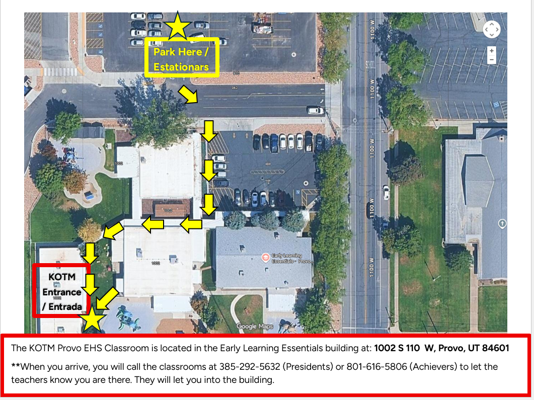 See the map for parking instructions. When you arrive, call the classrooms at 385-292-5632 (Presidents) or 801-616-5806 (Achievers) to let the teachers know you are there. They will let you into the building.